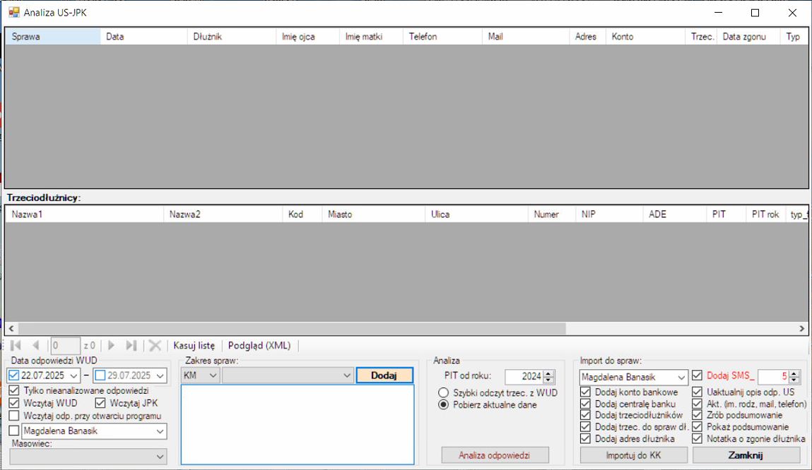 Program automatycznie znajduje pliki z odpowiedziami WUD-1k oraz pliki JPK, następnie automatycznie wyczytuje z nich dane osobowe dłużników oraz dane trzeciodłużników. Program pobiera najnowsze dane trzeciodłużników dostepne z rejestrów rządowych.
