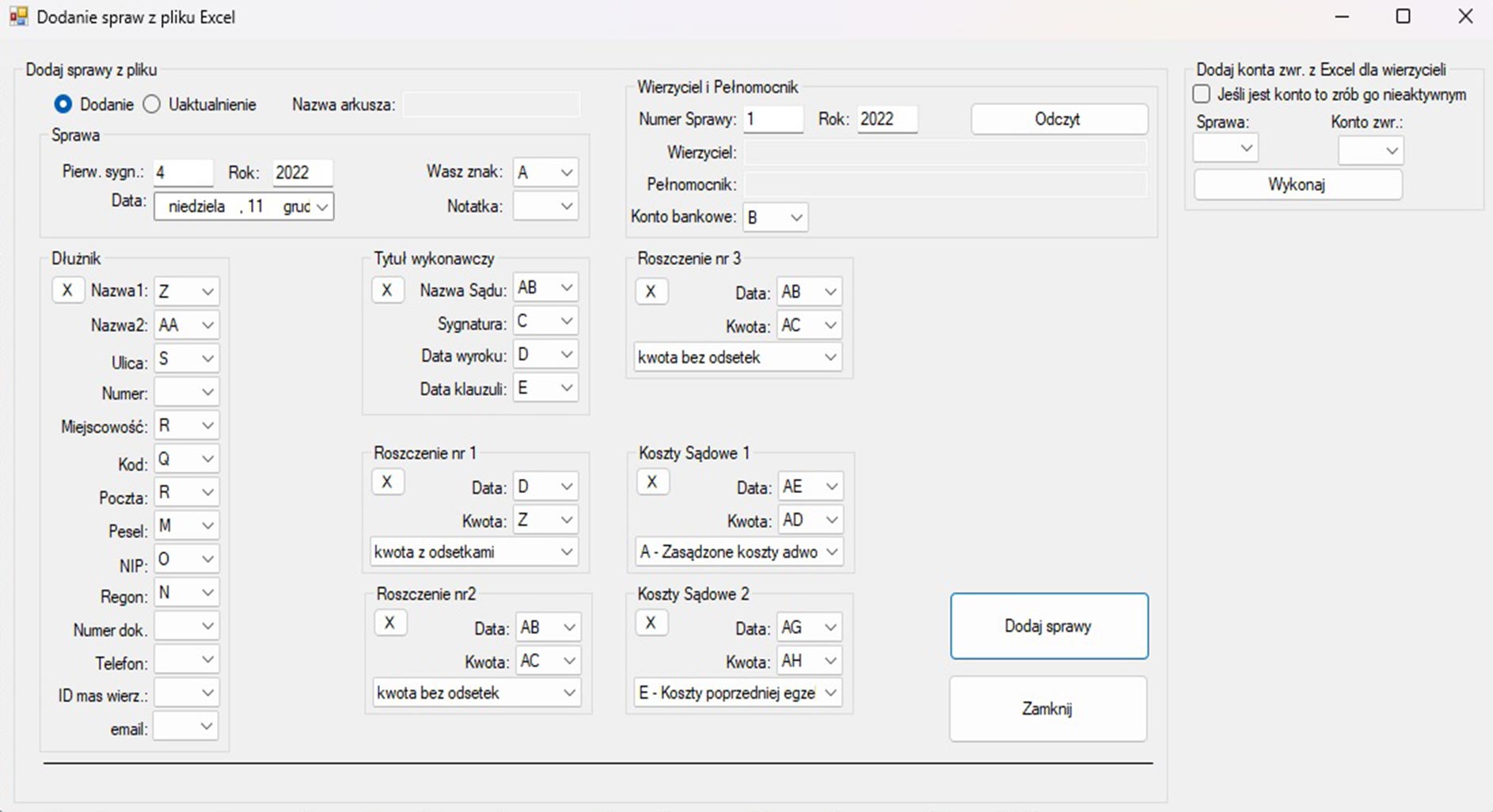 Zakładanie spraw z excela