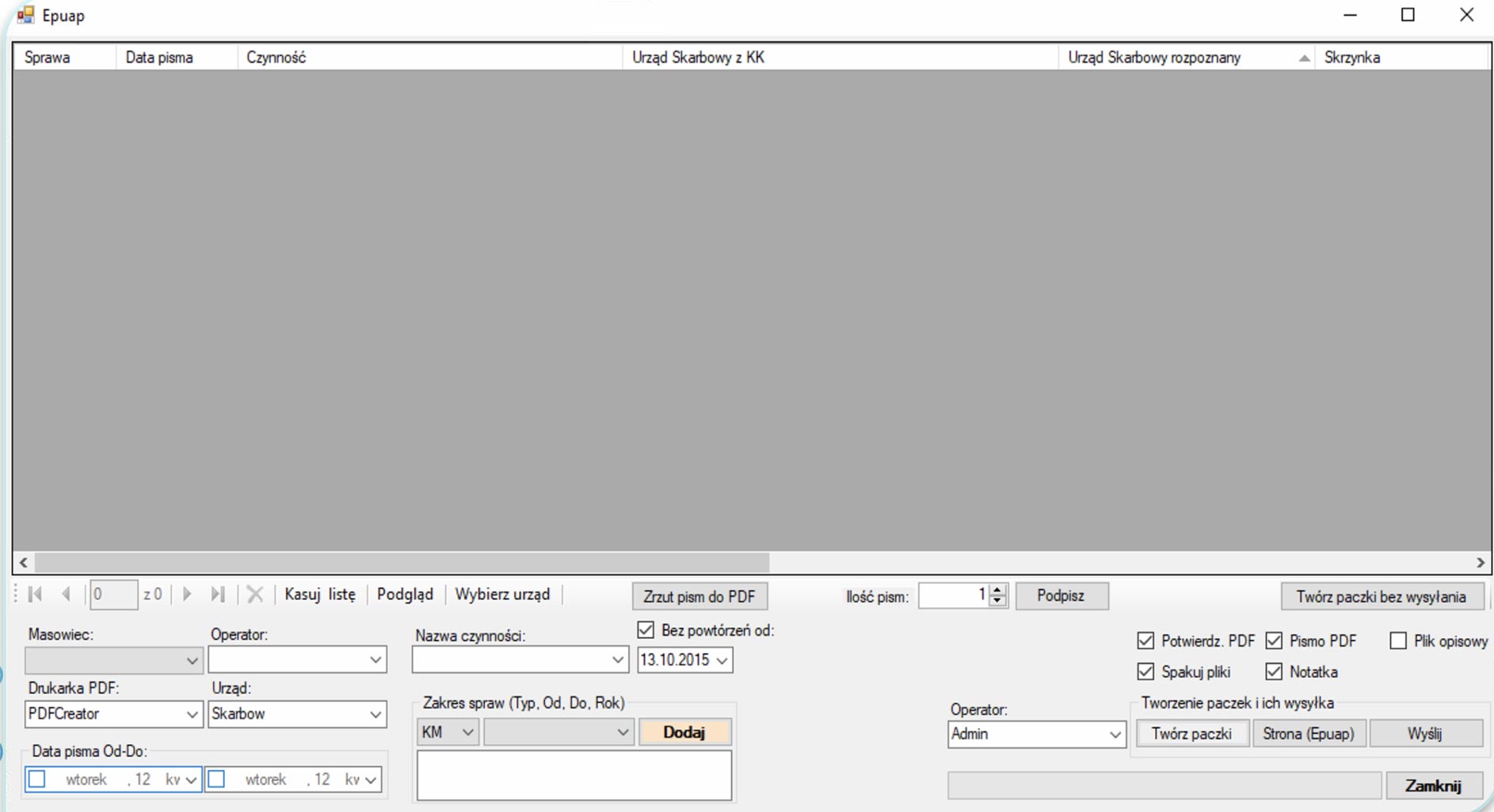 Program automatycznie znajdzie sprawy, w których znajdują się pisma przeznaczone do wysyłki na platformę ePUAP. Następnie pisma przenosi do formatu PDF i pakuje w paczki dzieląc je na konkretne urzędy skarbowe. Końcowym etapem jest automatyczne logowanie na strone ePUAP i wysyłka zrobionych paczek zwieńczona potwierdzeniem w sprawie.