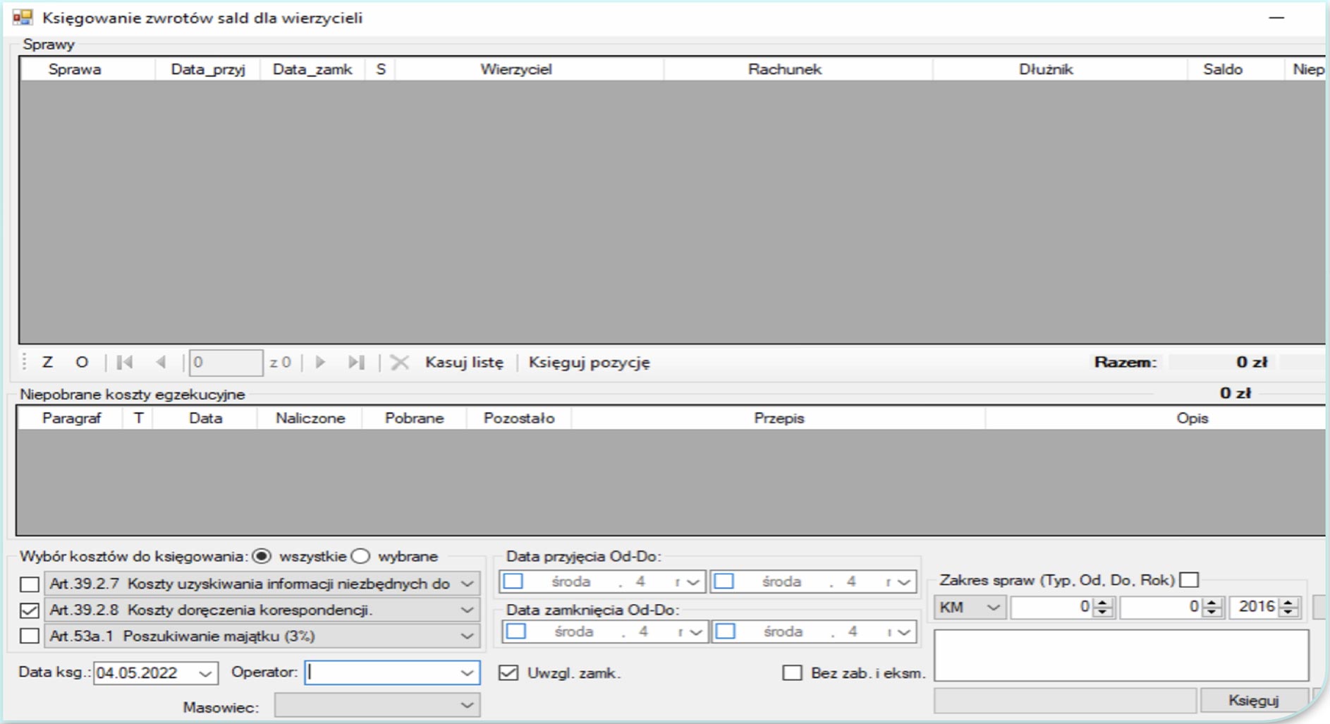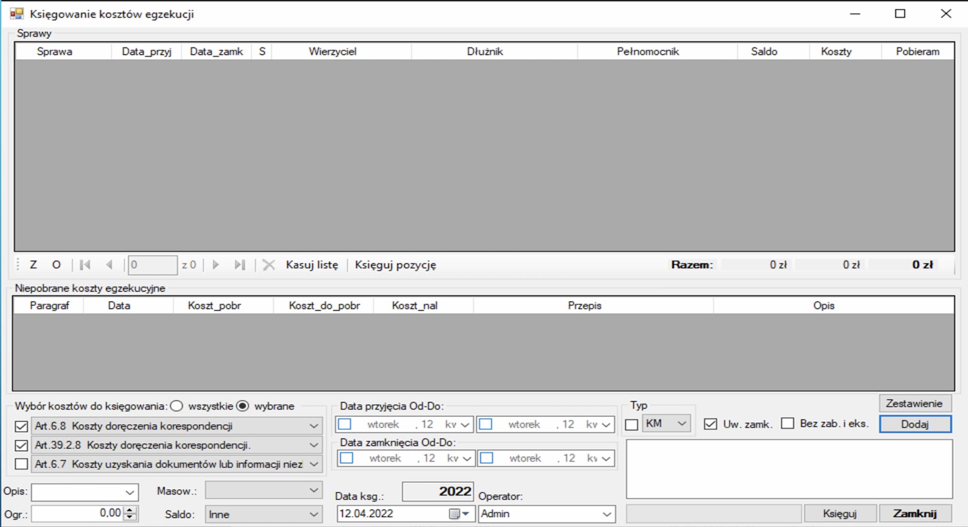Program automatycznie wyszuka koszty z danego artykułu w wybranym zakresie spraw. Jeżeli w wybranych sprawach znajdują się koszty do pobrania ze wskazanego artykułu oraz na saldzie mamy pieniądze na pokrycie tych kosztów to mamy możliwość automatycznego zaksięgowania takich kosztów.