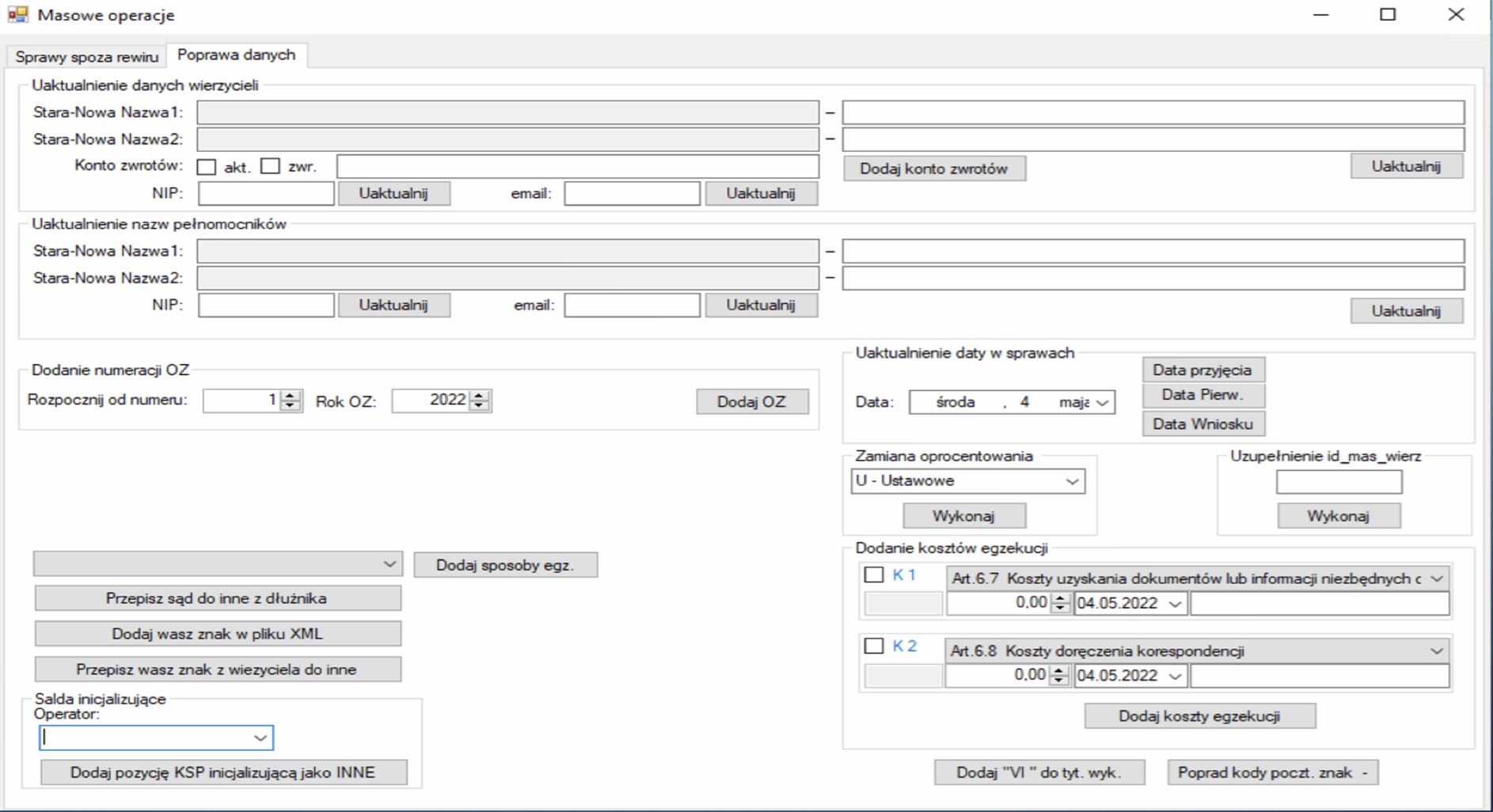 Program pozwala na masowe operację zmiany danych w zadanych sprawach. Programem posiada możliwość dodawania kosztów egzekucji w zadanych sprawach oraz zmianę odsetek w sprawach wprowadzonych za pomoca EPU.