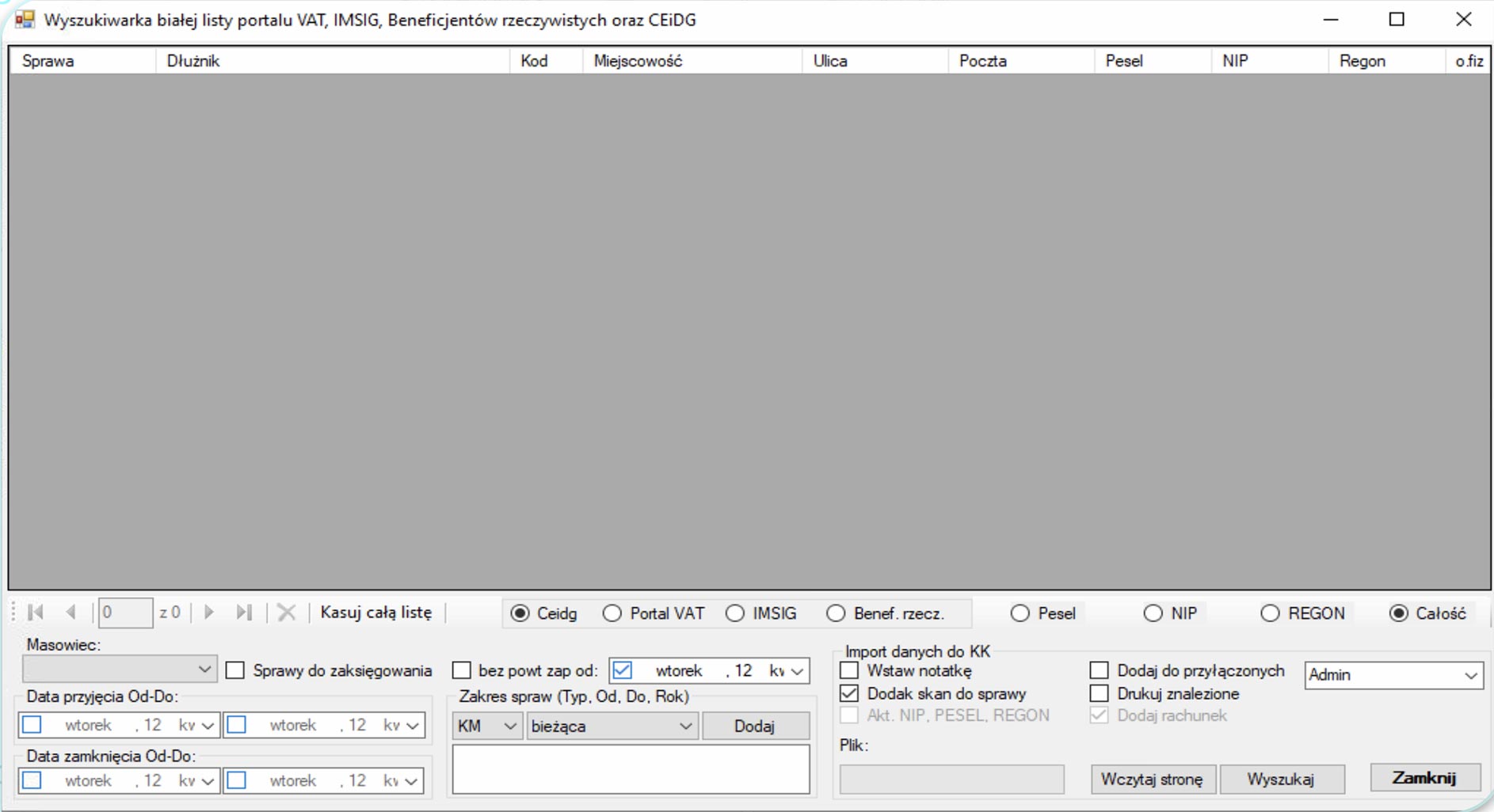 - Możliwość szukania po identyfikatorach typu pesel / regon