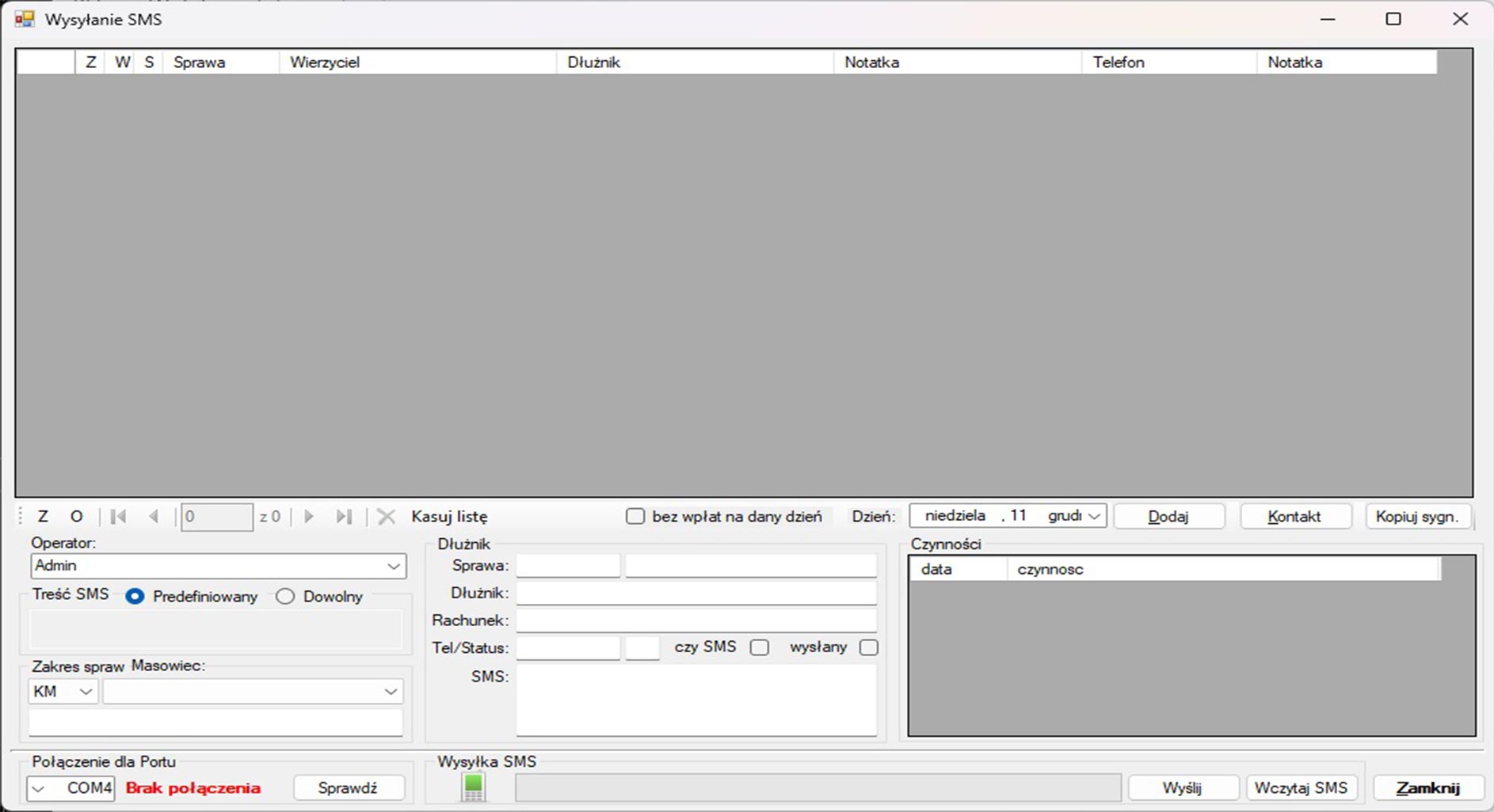 Program monitoruje terminy wpłat od dłużników, które wcześniej definiujemy w sprawie za pomocą notatki (ustalona data wpłaty, jej wysokość oraz numer telefonu dłużnika) Następnie program automatycznie sprawdza czy wpłata była dokonana, jeżeli nie to wyśle do dłużnika SMS z przypomnieniem o wpłacie.