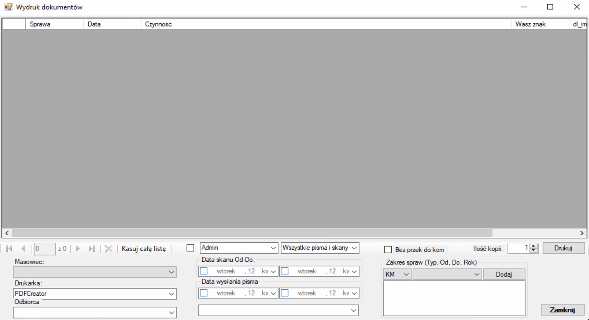 Możliwość drukowania wskazanych czynności i skanów w zadanych sprawach. Program sam przekazuje pisma i skany na drukarkę, posiada również opcję drukowania do pliku PDF. Możliwość drukowania całych spraw w kolejności w jakiej zostały tworzone pisma i skany.